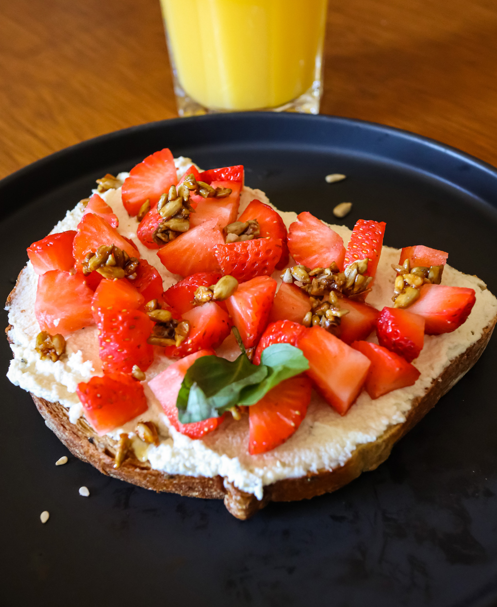Pan tostado con queso de almendras, fresas y semillas de girasol caramelizadas.