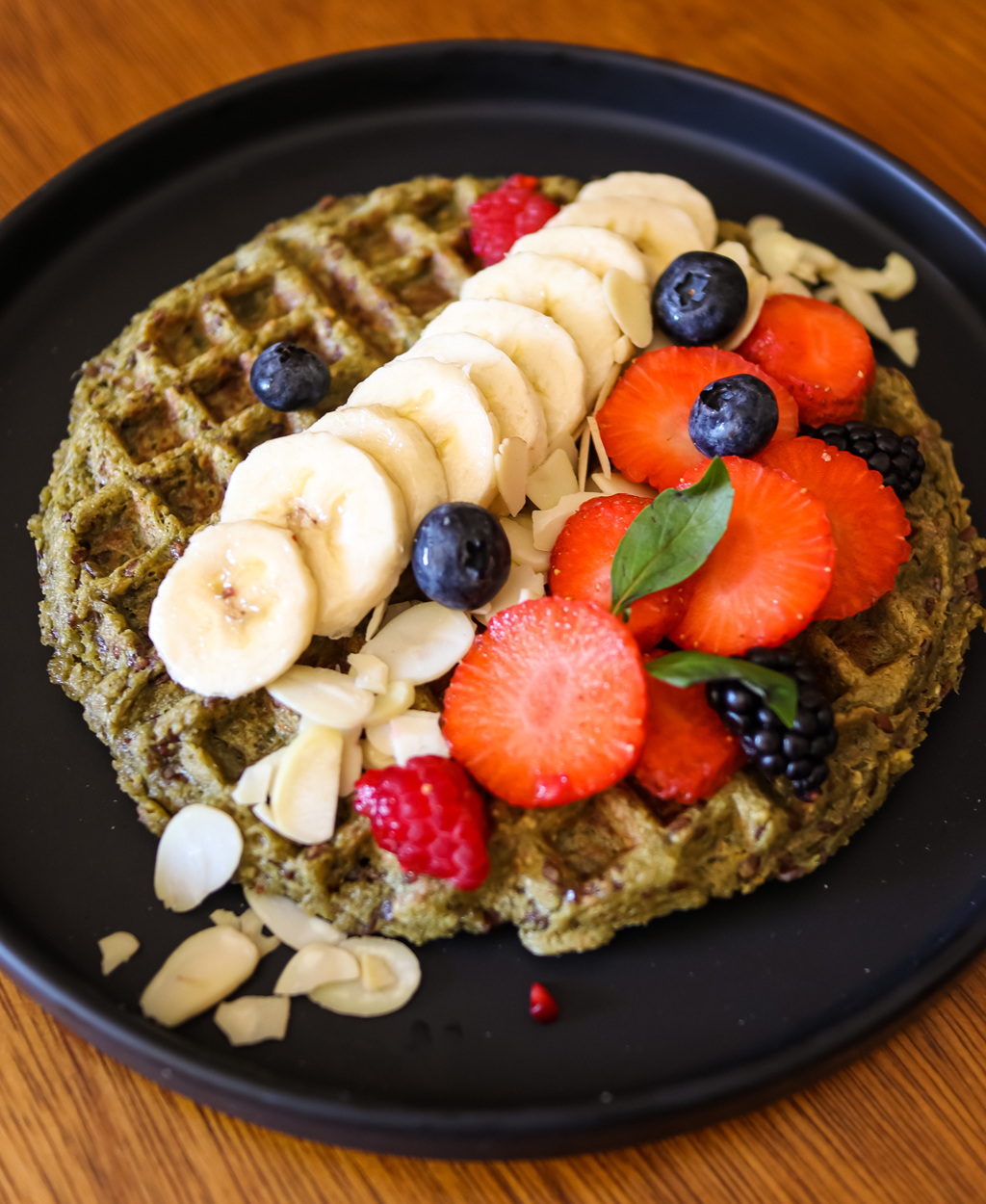 Waffle de avena con matcha, con fresas, almendras fileteadas, arándanos y plátano.