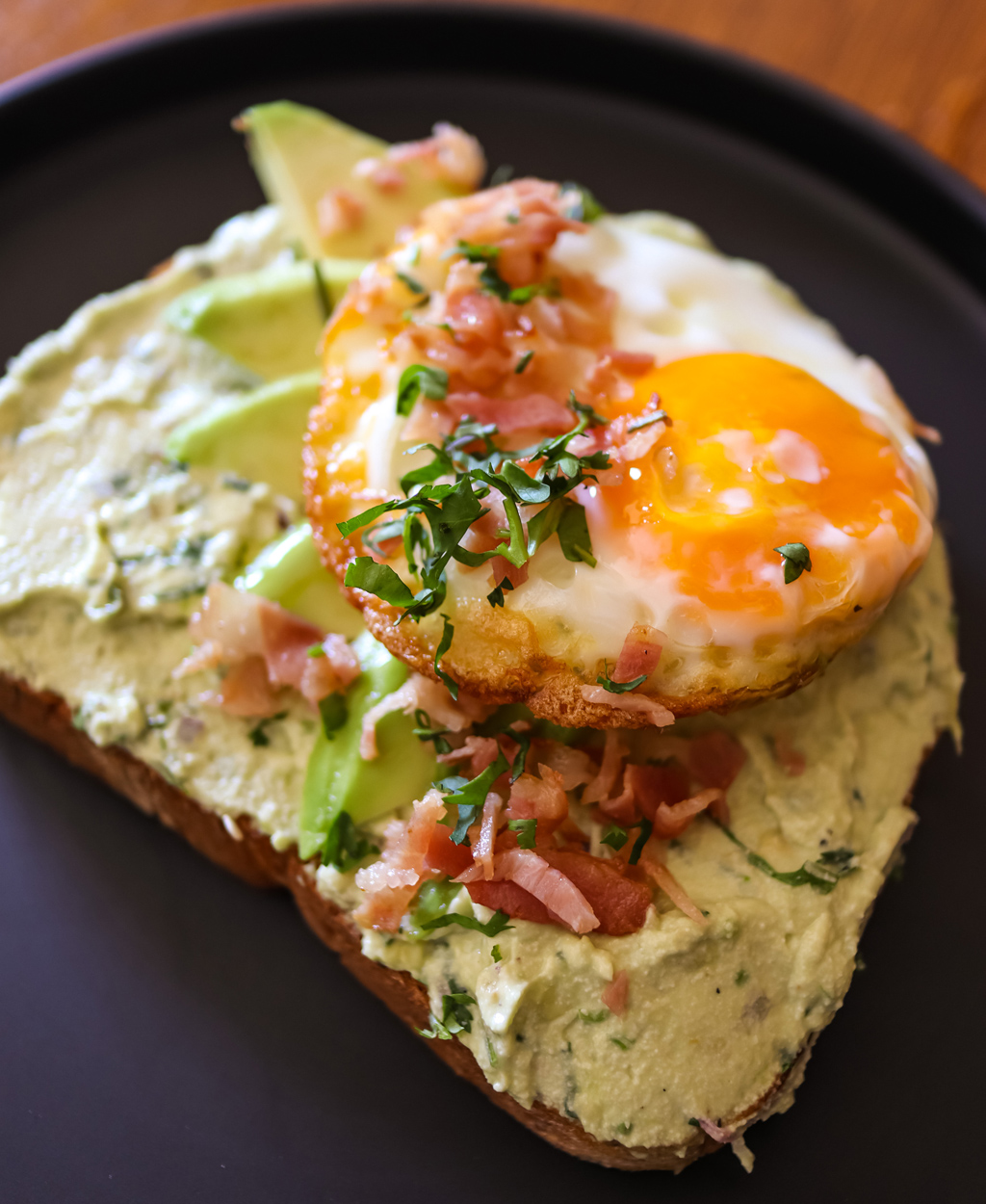 Pan tostado con mezcla de aguacate y queso de almendras, huevo estrellado, láminas de aguacate y tocino.